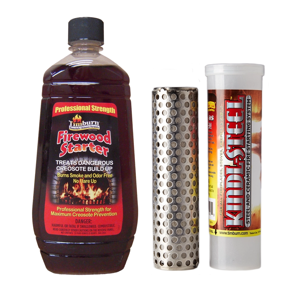 Timburn Housewarming Pack includes a Kindl-Steel log lighter for years of kindling free fire-starting and Timburn Professional Strength creosote fighting firewood starter oil. It starts a roaring fire in minutes with only 1.25 ounces of liquid per start while providing maximum protection against the buildup of dangerous chimney deposits. It will start 25 fires from the 32 ounce bottle.
